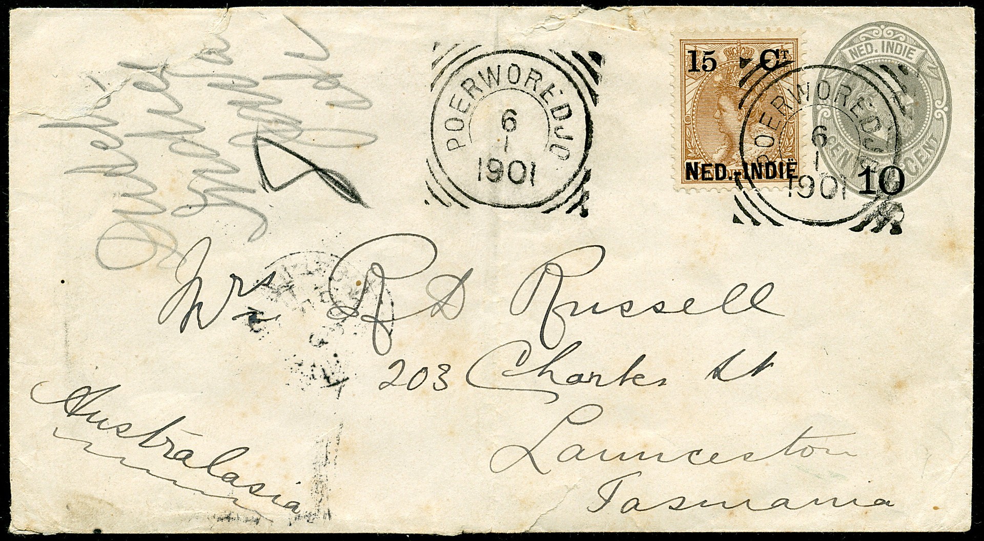 AUSTRALIË. TASMANIË. Env. G10 (wat gehavend) bijgefr. met 15c nr. 33 van Poerworedjo 6-1-1901 naar Launceston 9-2. Zeldzaam!