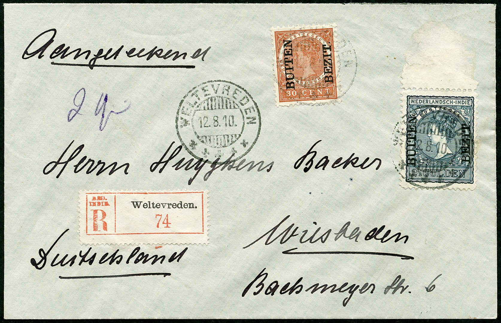 DUITSLAND. 2½ Gulden Buiten Bezit. nr. 98 met 30c nr. 95 op env. aangetekend van Weltevreden 12-8-1910 (kortebalk) naar Wiesbaden 7-9