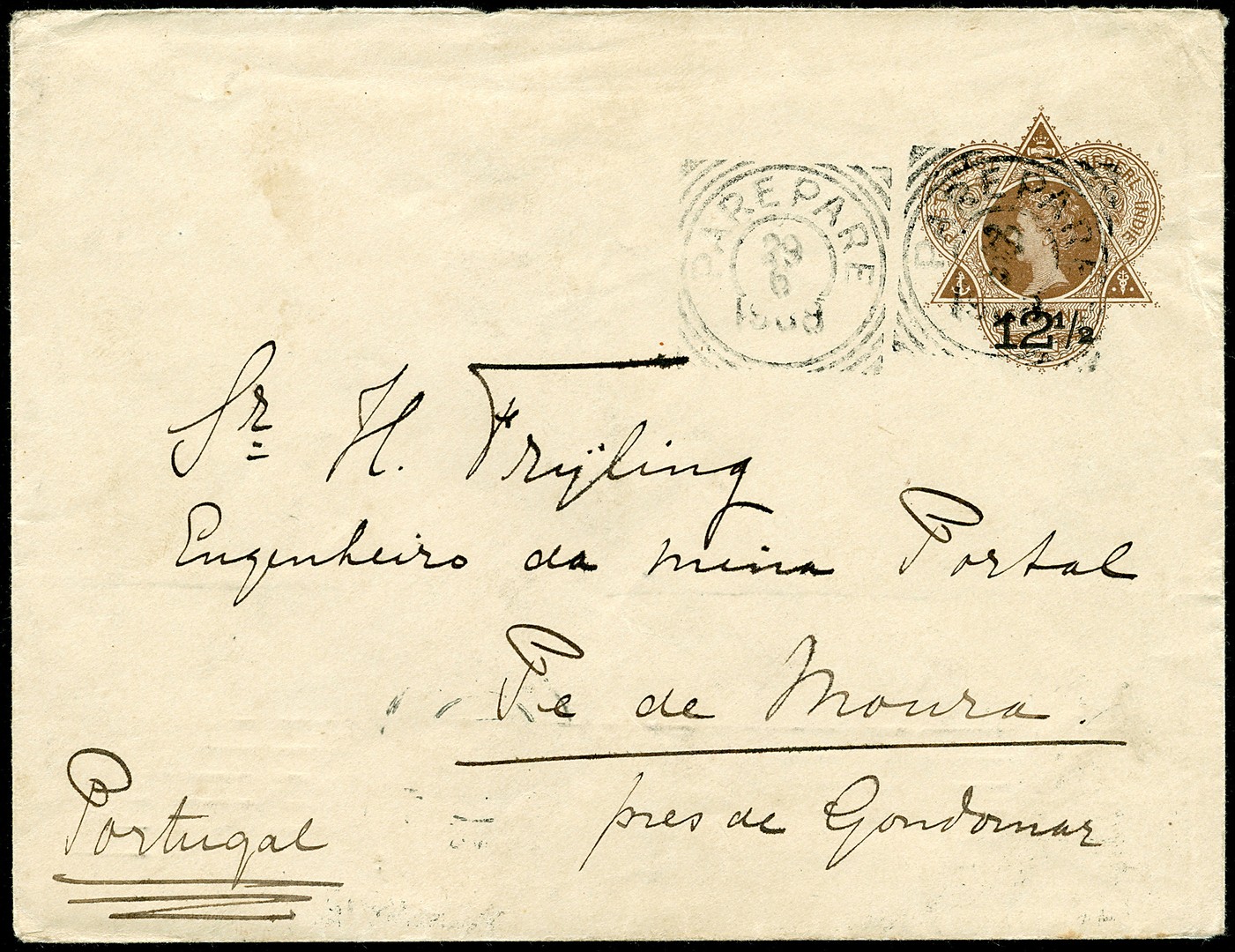 PORTUGAL. Env. G29 van Pare Pare 29-6-1908 (vierkant, SvL 100) via Makasser en Soerabaia 11-7 naar Pé de Moura bij Gondomar 14-8