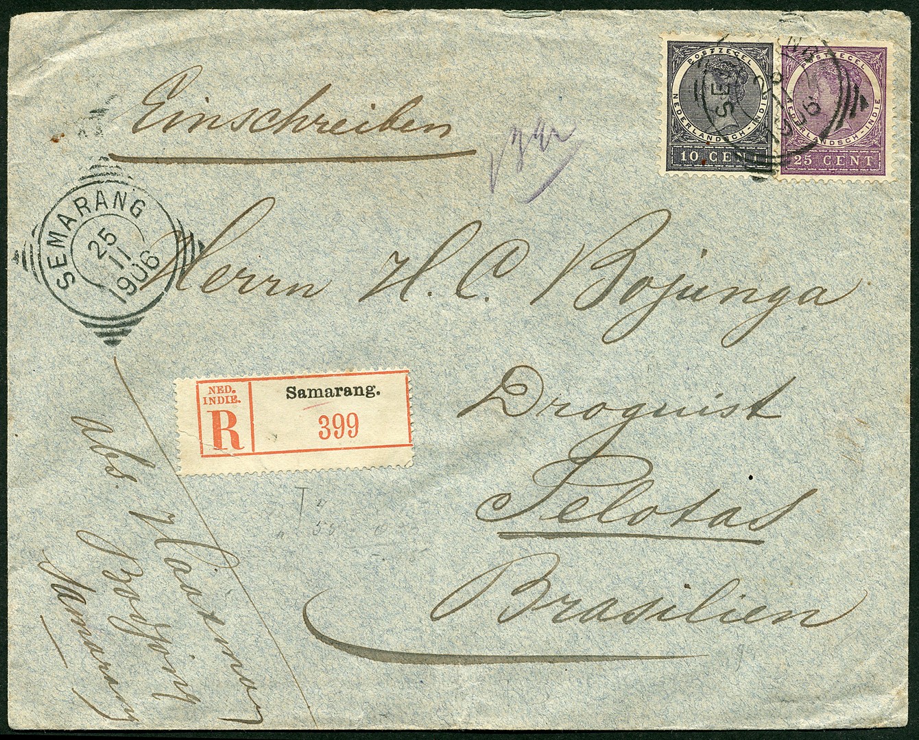 AMERIKA. BRAZILIË. 10 Cent nr. 48 en 25c nr. 55 op env. aangetekend van Semarang 25-11-1906 naar een drogist te Pelotas 23-1-1907. Zeldzame bestemming!