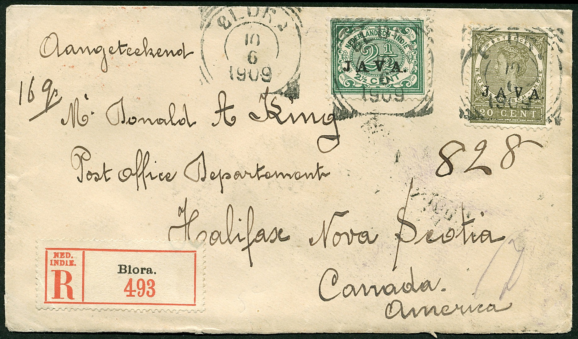 AMERIKA. CANADA. Bk. G21 bijgefr. met 10c nr. 48 aangetekend van Toeloengagoeng 6-12-1910 over Montreal 13-1-1911 naar Toronto 14-1. Tevens nrs. 66 en 74 op env. aangetekend van Blora 10-6-1909 naar Halifax, Nova Scotia (as. onleesbaar)
