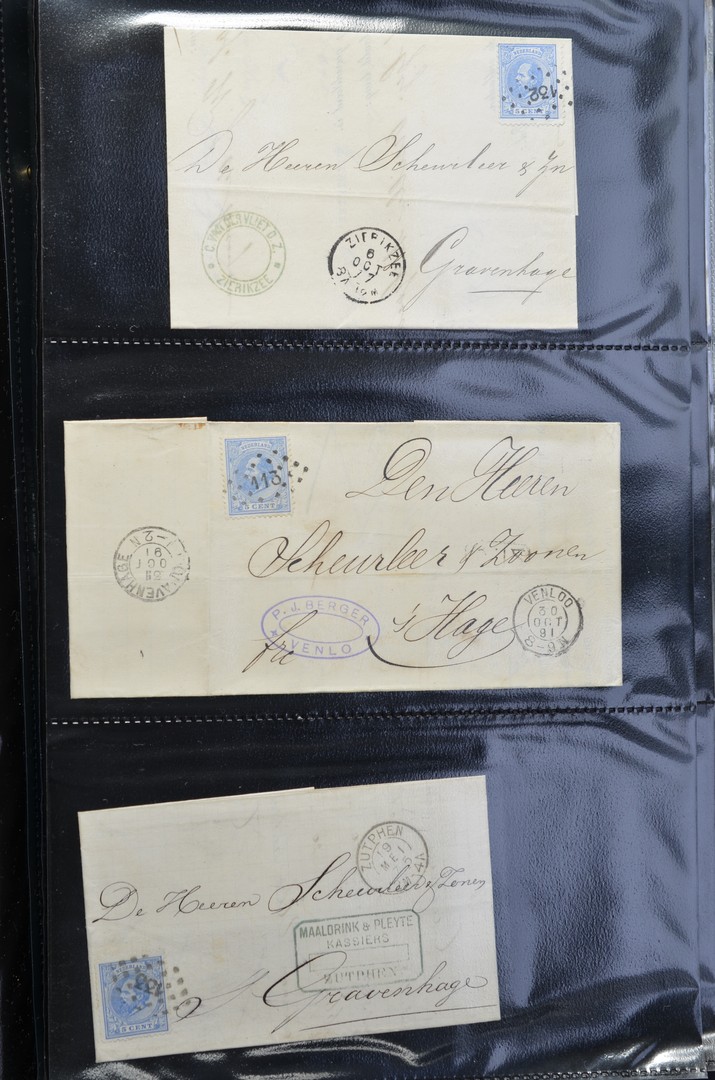 POSTHISTORIE. Ca. 380 poststukken vanaf ca. 1805 met frankeringen, stempels w.o. naam-, spoorwegtraject- en grootrond (daarbij van kleine kantoren), postale aanduidingen, tarieven, bestemmingen, censuur, iets oud buitenland, Selfkant, etc. in 2 albums