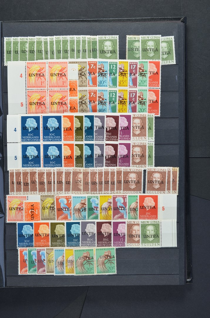 NED. NIEUW-GUINEA voorraad o/*/**, doch hoofdzakelijk UNTEA o/*/** in aantallen w.o. 1e druk, 2e druk, kleine opdrukken (incl. 43 **), enkele opdruk-variëteiten en afwijkingen, blokken , zegels met velrand, en enkele FDCs