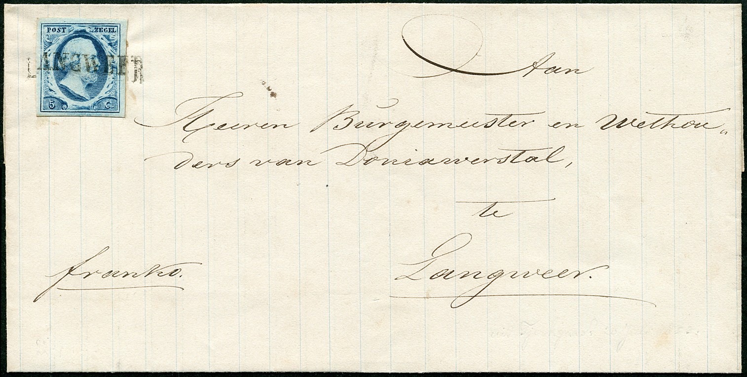 LANGWEER (EY.R) op 5 cent blauw nr. 1b, plaat I. Breed gerande prachtzegel (schijnbaar afgeweekt geweest) op frisse, gedateerde briefomslag naar de burgemeester en wethouders van Doniawerstal te Langweer, aldaar ontvangen op 22-7-1853
