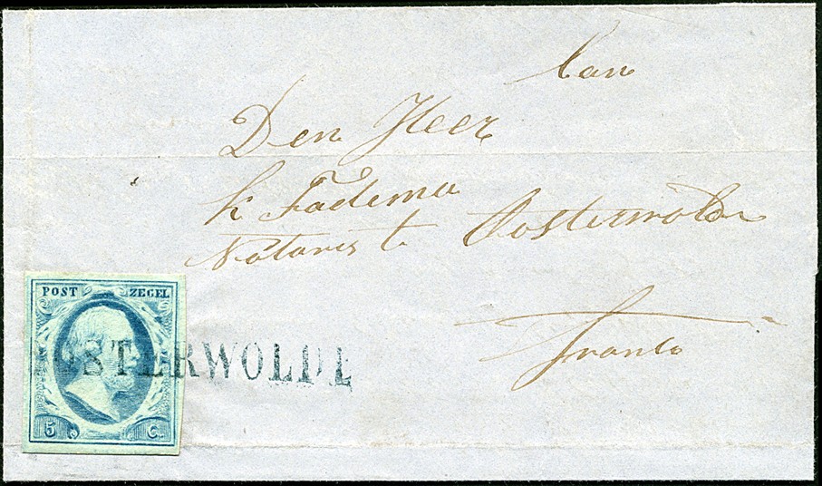 OOSTERWOLDE in blauw (EY.100) op 5 cent lichtblauw. Prachtex. met mooie afst. op fris vouwbriefje van Haulerwijk 10-11-1858 naar de bekende notaris te Oosterwolde