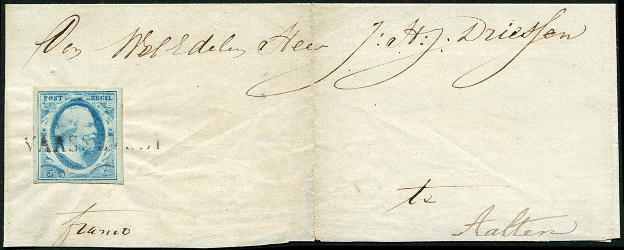 VARSSEVELD (EY.250) op 5 cent helderblauw nr. 1l, plaat IV pos. 99. Prachtex. met goed leesbare afst. op ongedateerde briefomslag/groot briefdeel naar Aalten. Varsseveld staat niet gecatalogiseerd als bekend op brief. Ex van Dieten en Berghuijs