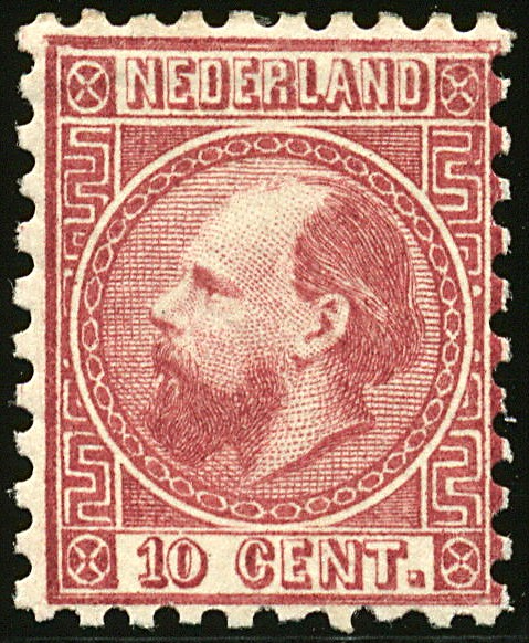10 Cent karmijn type II in lijntanding 10½:10¼ nr. 8IIB. Ongebruikt prachtex. met volle, originele gom en zeer fris van kleur. € 425