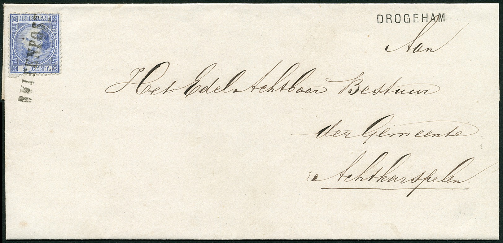 BUITENPOST in schreefletters in zwart op 5 cent. Prachtex. met mooie afst. op zeer frisse briefomslag (az. pennotitie '11 Mei 1872') van Drogeham (superbe afdruk naamstempel in schreefloze letters) naar het gemeentebestuur van Achtkarspelen, dat resideerde in Buitenpost