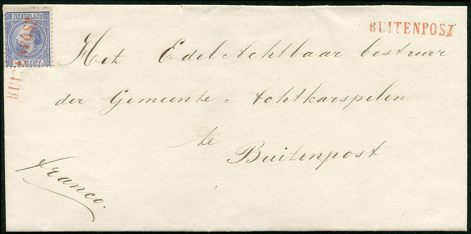 BUITENPOST in schreefletters in rood op 5 cent. Prachtex. met mooie afst. (tevens rechtsboven) op zeer frisse, ongedateerde deels dichtgeplakte briefomslag