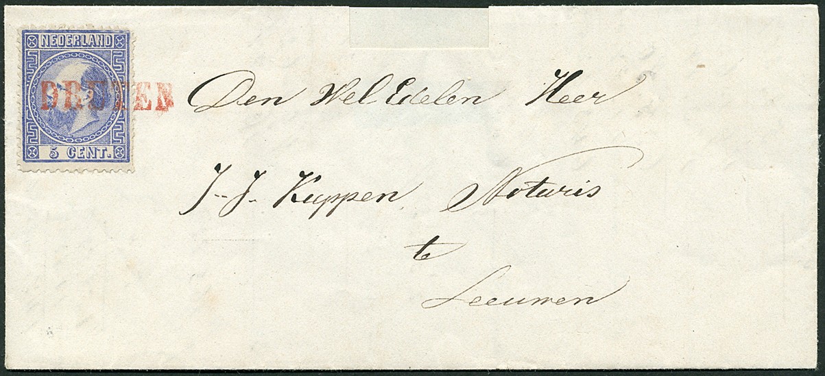 DRUTEN in schreefletters in rood op 5 cent. Vrijwel prachtex. met zeer mooie afst. op frisse, incomplete en bovenaan iets gerepareerde vouwbrief (feitelijk: factuur) van 14-10-1871 naar een notaris te Leeuwen