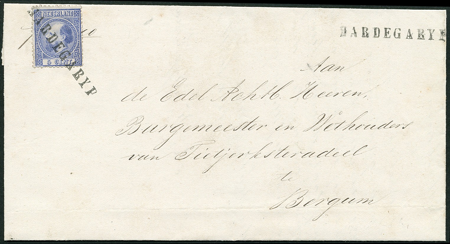 HARDEGARYP in schreefletters in zwart op 5 cent. Prachtex. met prettige stempelafdruk (rechtsboven ook) op frisse vouwbrief van Tietjerk 17-5-1870 naar het bestuur van Tietjerkstradeel te Bergum