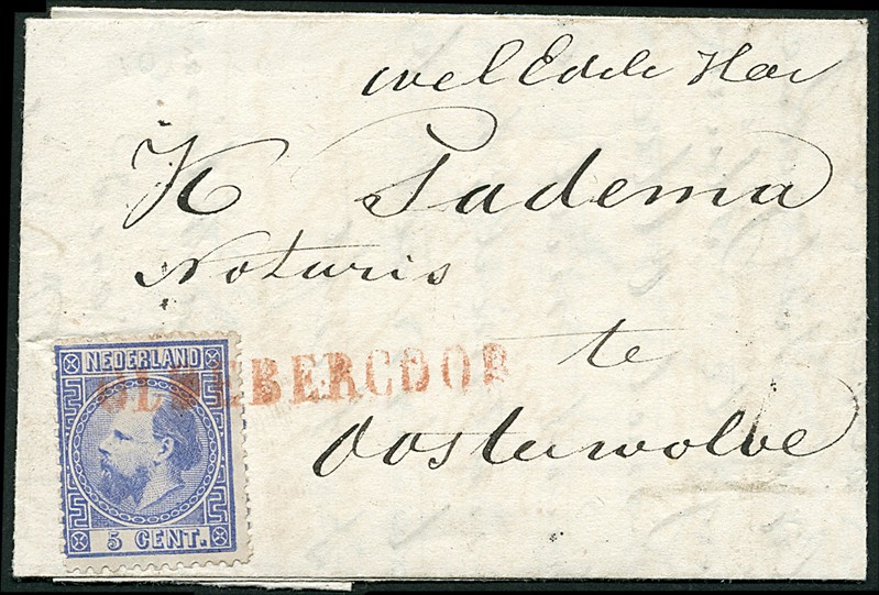 OLDEBERCOOP in schreefletters in rood op 5 cent. Prachtex. op vouwbrief van Oudehaske 10-3-1870 over OLDEBERCOOP naar de notaris van Oosterwolde
