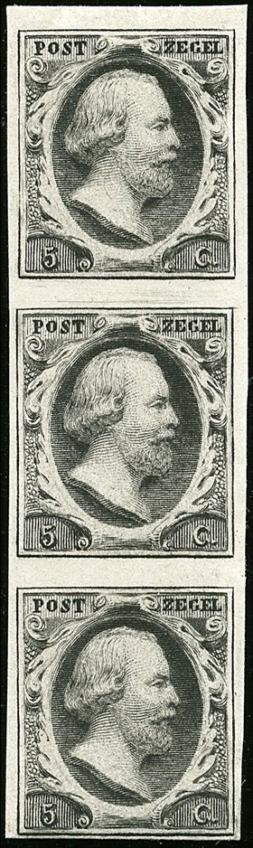 Zwarte zegelafdruk van de goedgekeurde plaat I op dik wit kartonpapier, zonder watermerk, ongetand. Gecatalogiseerd als PC.9. Verticale strip van drie, pos. 3/8/13. Mooie strip, zegels fris van kleur, onderste rand iets smal, overigens prachtig gerand