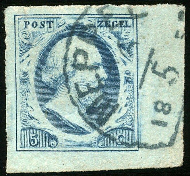 1f-Pl.II-100. Luxe hoekstuk met rechts nog een watermerklijn zichtbaar, afgestempeld in blauw met mooie afdruk Meppel C