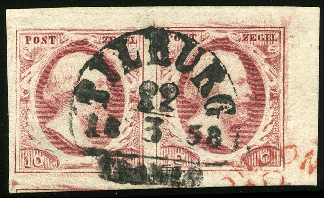 2g-Pl.IV-29/30. Breed tot zeer breed gerand luxe hoekpaar, fris van kleur, met mooie, centrale afstempeling Tilburg B en in de hoek fragment London