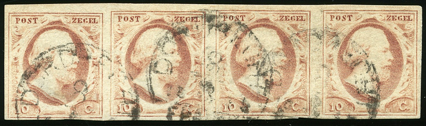 2g-Pl.IV-66/69. Goed tot redelijk gerande strip van vier (zegel pos. 68 knipje in onderrand). € 900