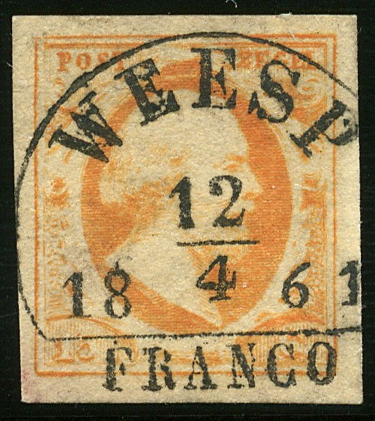 WEESP B (EY.400) op 15 cent. Prachtzegel met superbe afst. op de dag, dat het halfrond-francostempel officieel werd afgeschaft voor gewone postkantoren