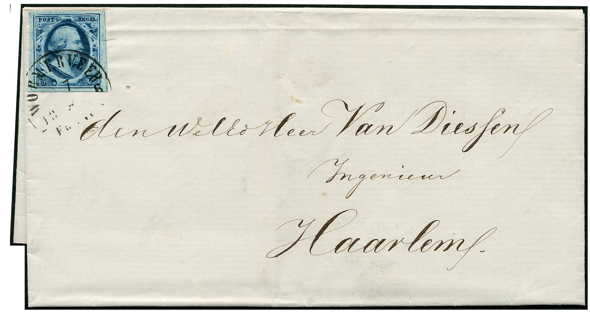 WORMERVEER B (EY.50) op 5 cent donkerblauw nr. 1i-Pl.III-69. Prachtzegel met duidelijke afst. op zeer frisse, complete vouwbrief van 17-5-1856 naar een ingenieur te Haarlem 17-5