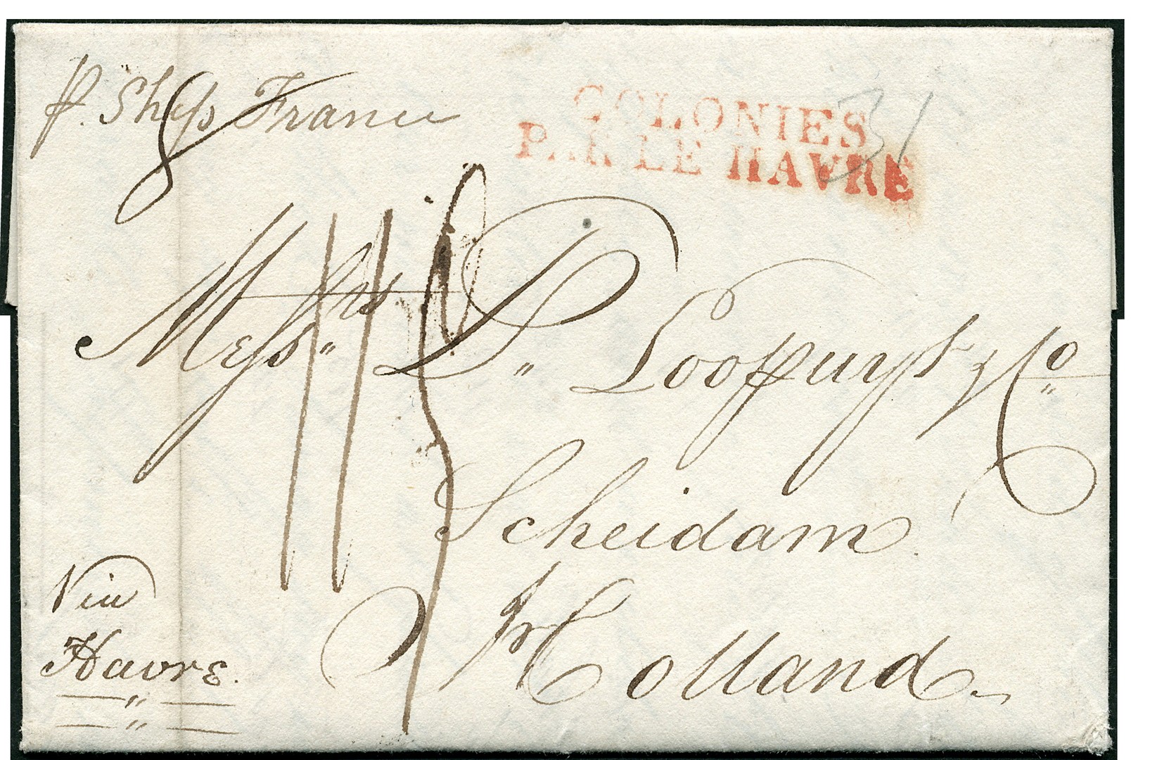 Zeer frisse, complete vouwbrief van Boston 7-12-1827 verzonden met het schip de 'France' (in januari 1827 in de vaart gekomen na de fusie van de First en Second Line) via Le Havre naar Schiedam, met op vz. in rood 'COLONIES / PAR LE HAVRE'