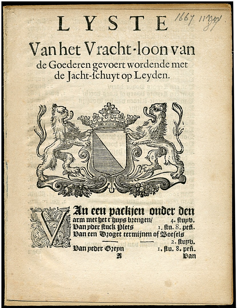 Expeditiediensten. 'Lyste Van het Vracht-loon van de Goederen gevoert wordende met de Jacht-schuyt op Leyden' (vb. 'Van een Brief - 2 stuyv.[ers]' uit 1677. Zeer goed bewaard gebleven prachtig gedrukt document
