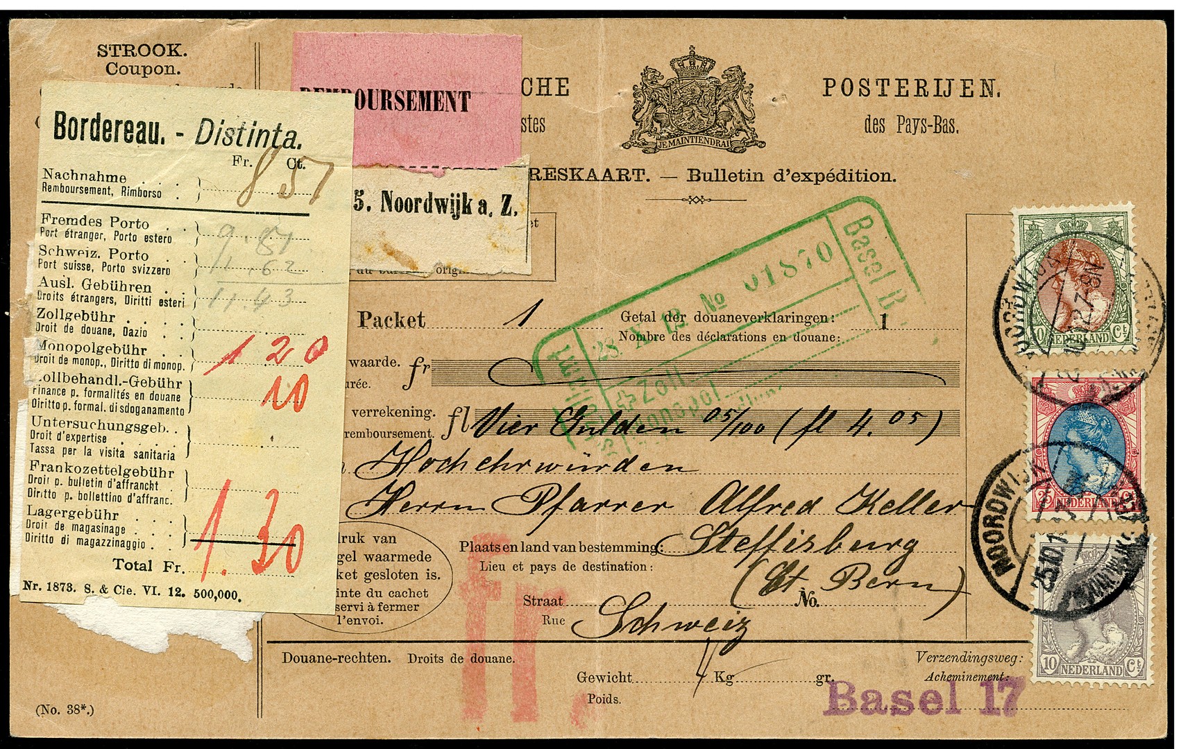 Adreskaart gefr. met 10c, 25c en 50c Bontkraag voor een pakket van Noordwijk aan Zee 25-10-1912 onder rembours via Emmerich en Basel naar Steffisburg 28-10. Aantrekkelijke Bontkraagfrankering!