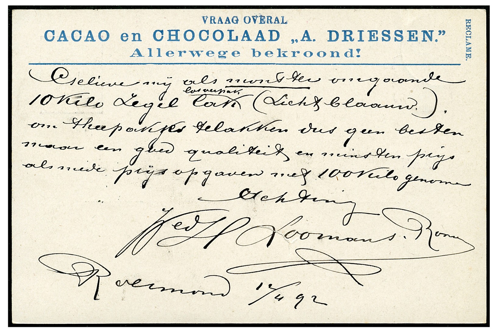Bk. van 2½c (scheurtje in het midden) met op az. in blauw bedrukte reclame voor 'Cacao en Chocolaad...' van Roermond 12-4-1892 naar Apeldoorn 13-4
