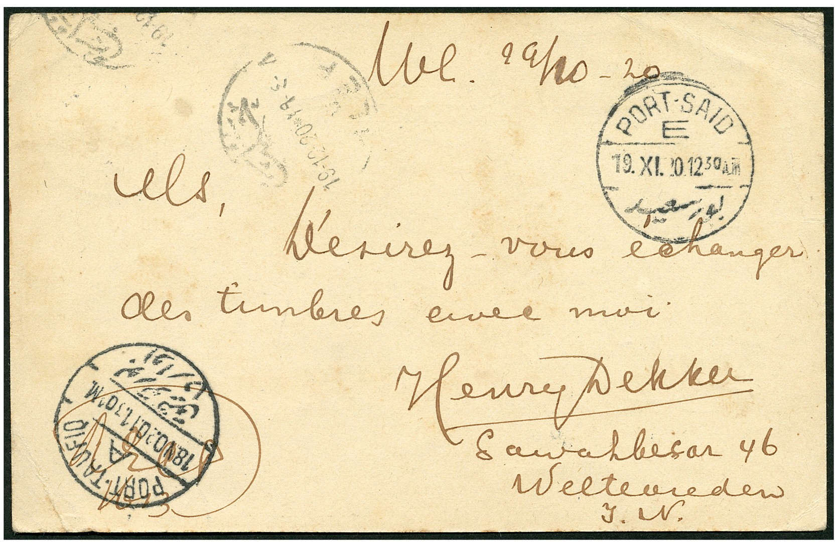 AZIË. SYRIË. Bk. G27 van Weltevreden 19-10-1920 over Port Taufiq 18-11 en Port Said 19-11 naar Aleppo 19-12. Tevens bijgevoegd een kleurige prentbk. uit 1922 van Aleppo (Alep), die toont hoe mooi de stad was. Zeldzame kaart, die dankzij de filatelie bewaard is gebleven