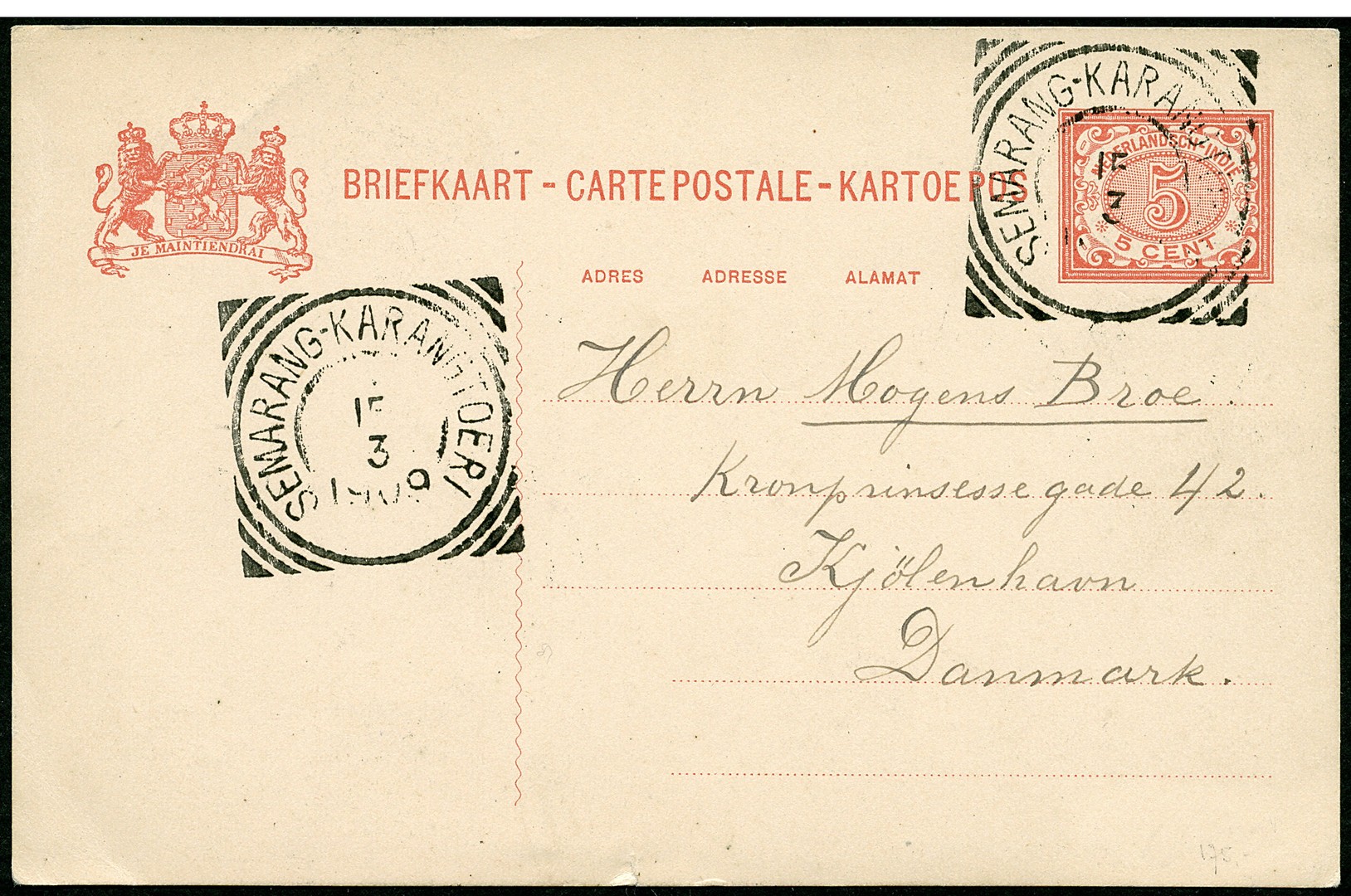 DENEMARKEN. Drie poststukken waarop vierkantstempels. Env. G26 bijgefr. met 3c en 7½c van Klaten 14-11-1908 naar Kallundborg 14-12, bk. G14 van Edi 10-9-1908 alsmede van Semarang-Karangtoeri 15-3-1909, beide naar Kopenhagen
