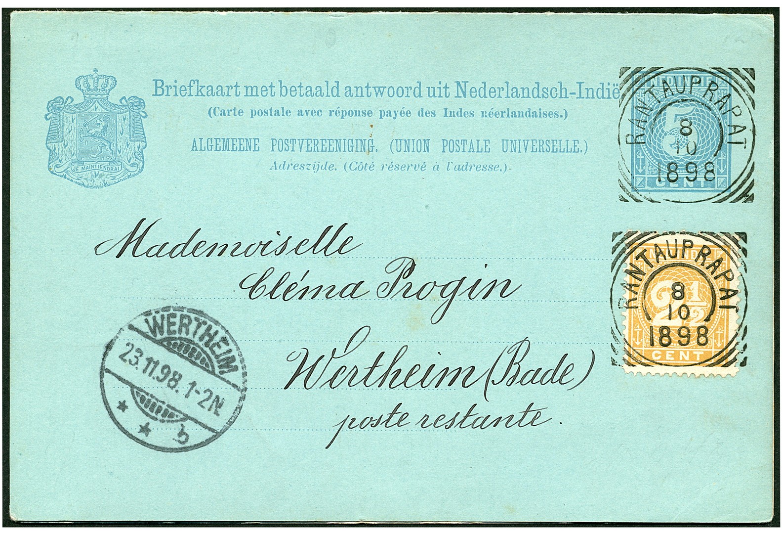 DUITSLAND. Dubbele bk. G11 met nog aanhangende, onbeschreven antwoordkaart, beide delen bijgefr. met 2½c en superbe afgest. met Rantauprapat 8-10-1898 (SvL 225, ook de A-kaart), naar Wertheim 23-11. Oogstrelend stuk naar een mademoiselle