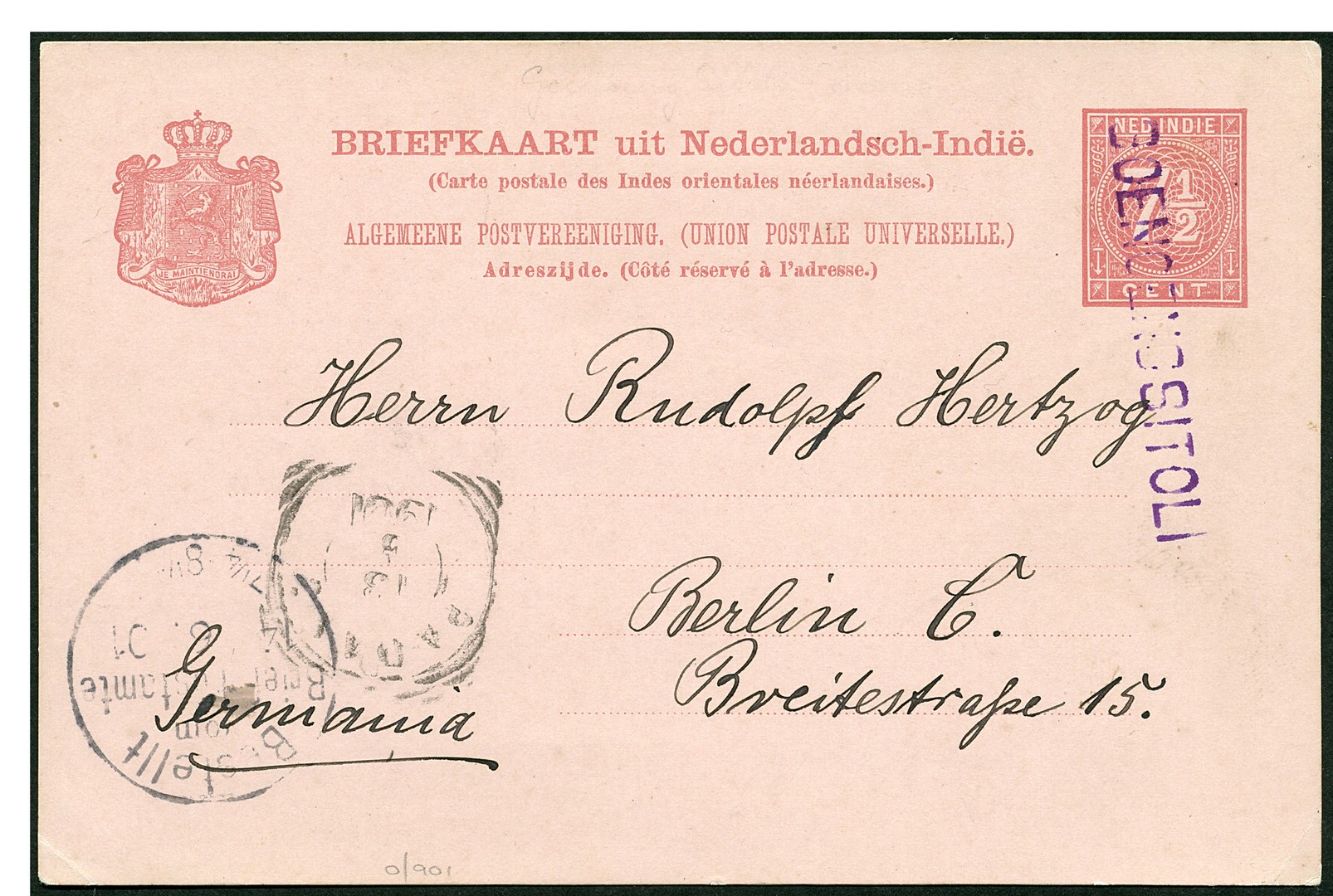 DUITSLAND. Zes briefkaarten met naamstempels. G8 bijgefr. met 2½c van MARABAHAN (blauw) naar Lauban 29-4, G12 van GOENOENGSITOLI (violet) naar Berlijn 14-6-1901, G12 van SOENGEI RAMPAH (zwart) naar Leipzig 16-9-1905, G14 van PRIOKTJAHOE (lichte afst. in violet) over Bandjermasin 19-12-1908 naar Berlijn, G21 van BANGOENPOERBA (violet) over Medan 12-12-1910 naar Berlijn-Schöneberg alsmede prentbk. gefr. met 5c (hoekvouw) van GALANG (violet) over Medan 8-3-1912 naar München