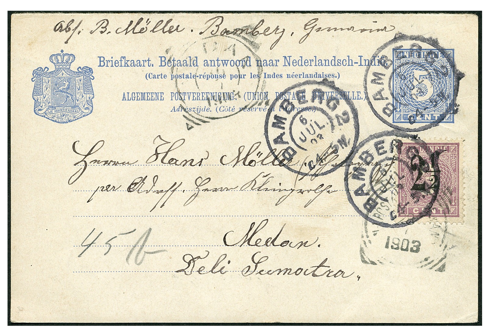 DUITSLAND. Bk. G11 A-kaart bijgefr. met 2½c nr. 39 van Bamberg 6-7-1903 over de N.I.Postagent Penang 28-7 naar Medan 29-7
