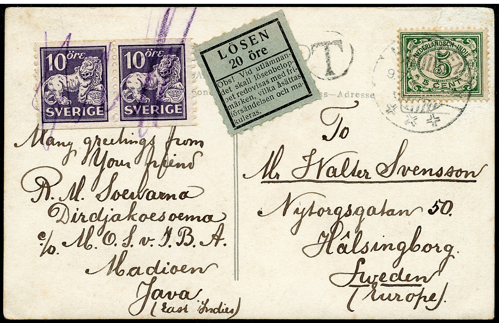 ZWEDEN. Env. gefr. met ½c, 2c en 2x 5c van Buitenzorg (waarschijnlijk ’s Lands Plantentuin) 13-3-1917 naar Stockholm 2-6, met Britse censuurstrook, alsmede fotoprentbk. gefr. met 5c van Madioen 9-7-1929 naar Halsingborg en met 20ö beport omdat het tarief vanuit Indië 10 cent bedroeg