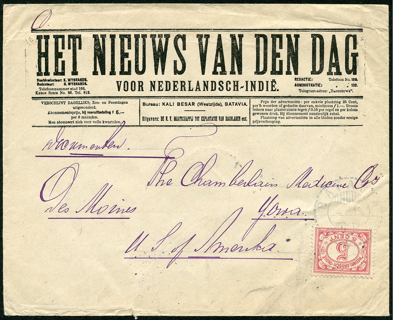 AMERIKA. USA. Env. (iets gekreukeld) van de courant ‘Het Nieuws van den Dag’ als ‘Documenten’ gefr. met 5c (maar het minimumport is 15 cent), van Batavia 4-5-1915 over Weltevreden naar Des Moines