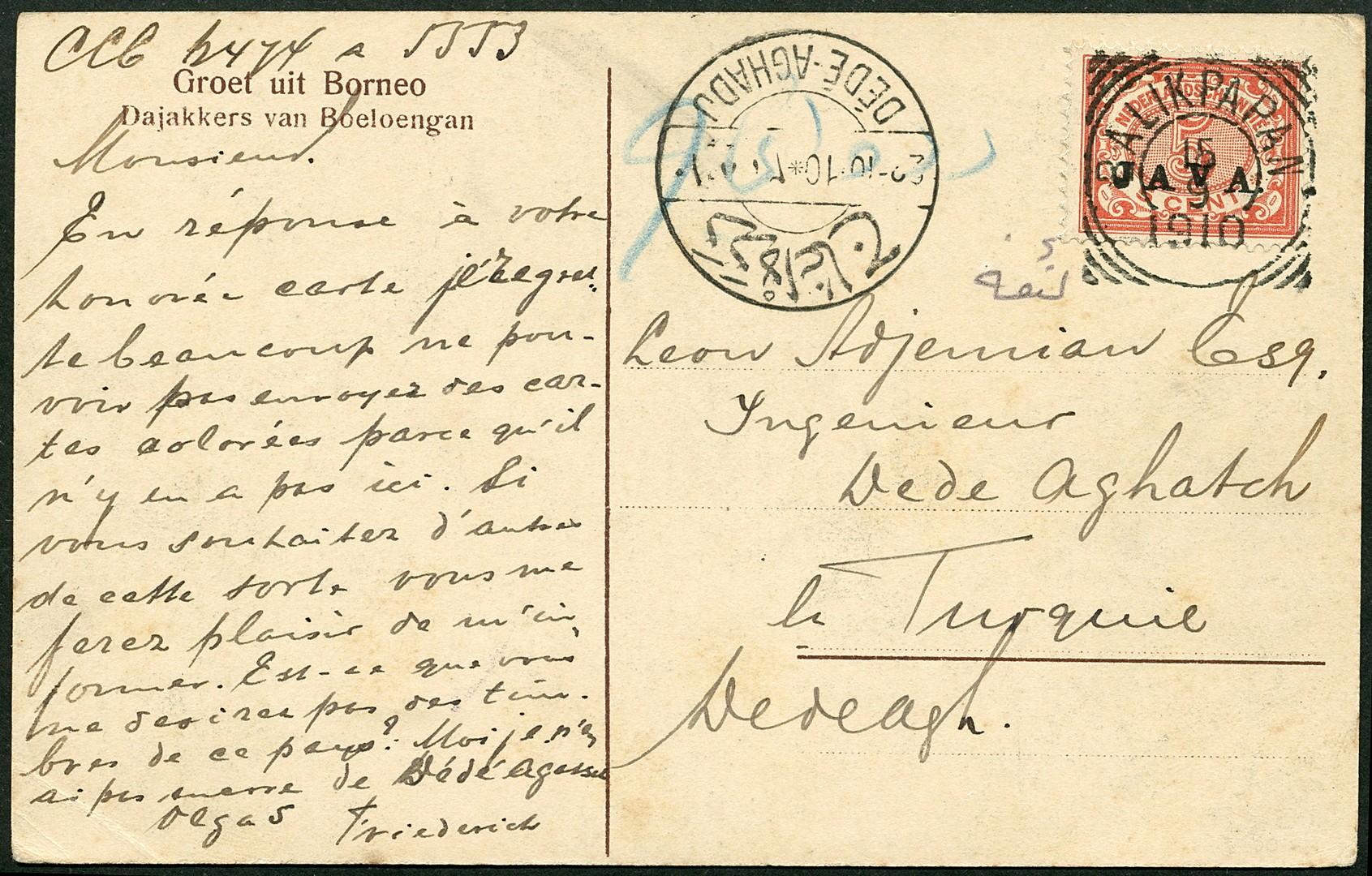 AZIË. TURKIJE. Prentbk. van Dajakkers gefr. met 5c Java-opdruk van Balikpapan 15-9-1910 naar Dédé-Aghadj 22-10. Zeldzame bestemming vanuit Borneo!