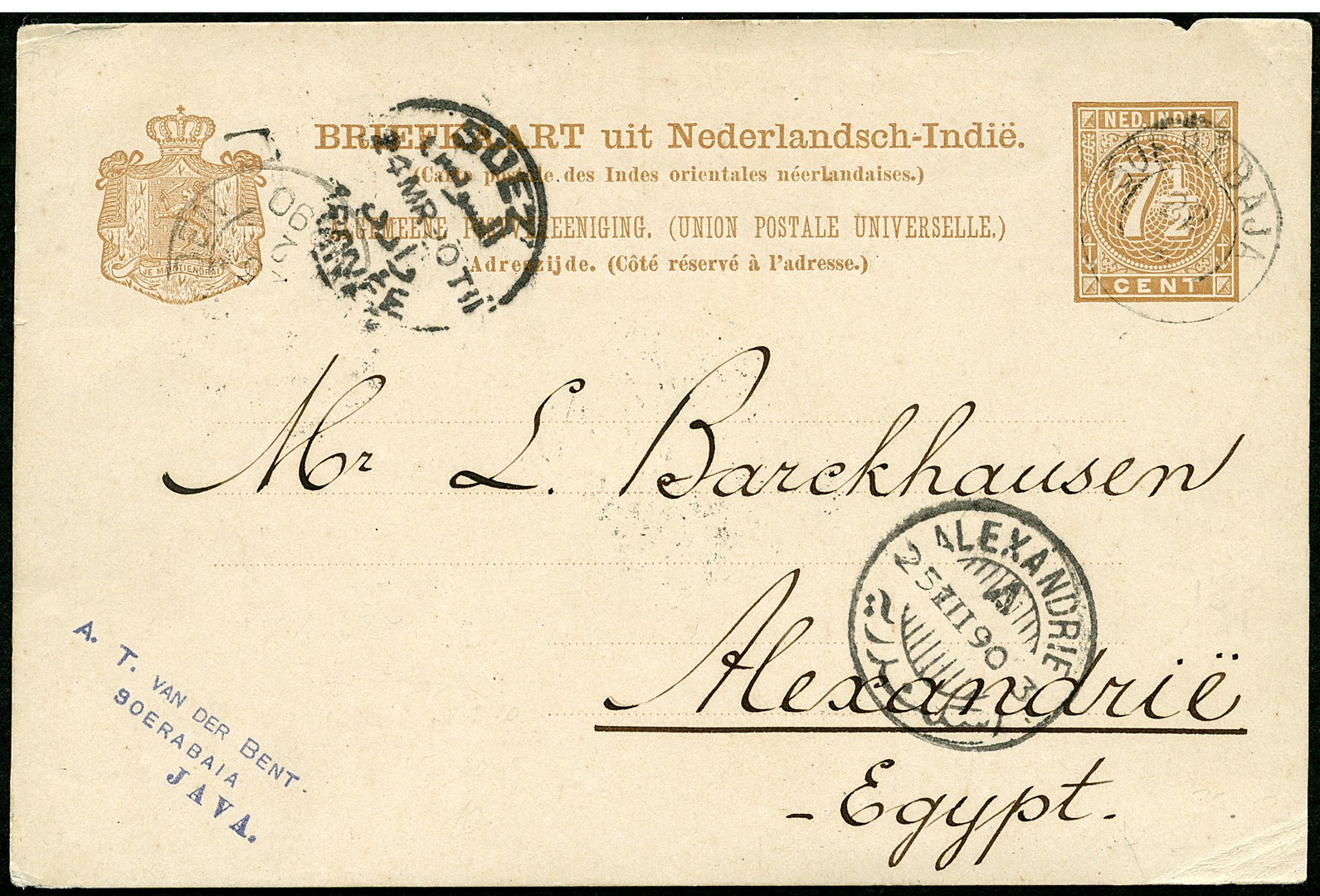 AFRIKA. EGYPTE. Bk. G9 van Soerabaja 22-2-1890 over Weltevreden en Suez 24-3 naar Alexandrie 25-3, alsmede env. G15 (vert. vouw) bijgefr. met 2½c van Kedong Djatti (naamstempel) via Weltevreden 3-10-1905 en Port Tewfik 27-10 naar een dame aan boord van het S.S. Ophir te Suez 27-10