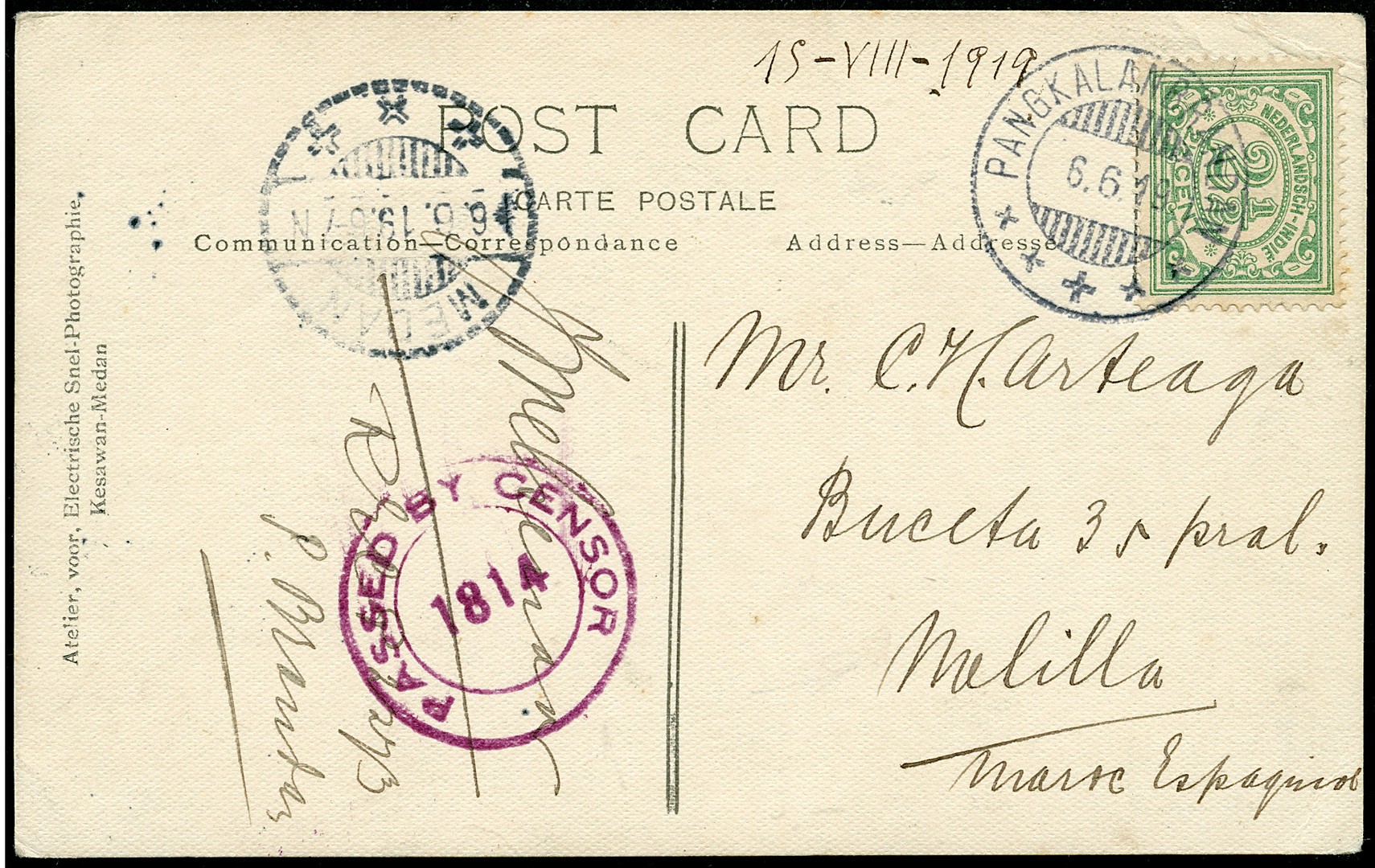 AFRIKA. MAROKKO (SPAANS). Prentbk. gefr. met 2½c van Pangkalanbrandan 6-6-1919 over Medan, onderweg gecensureerd, naar de Spaanse enclave Melilla
