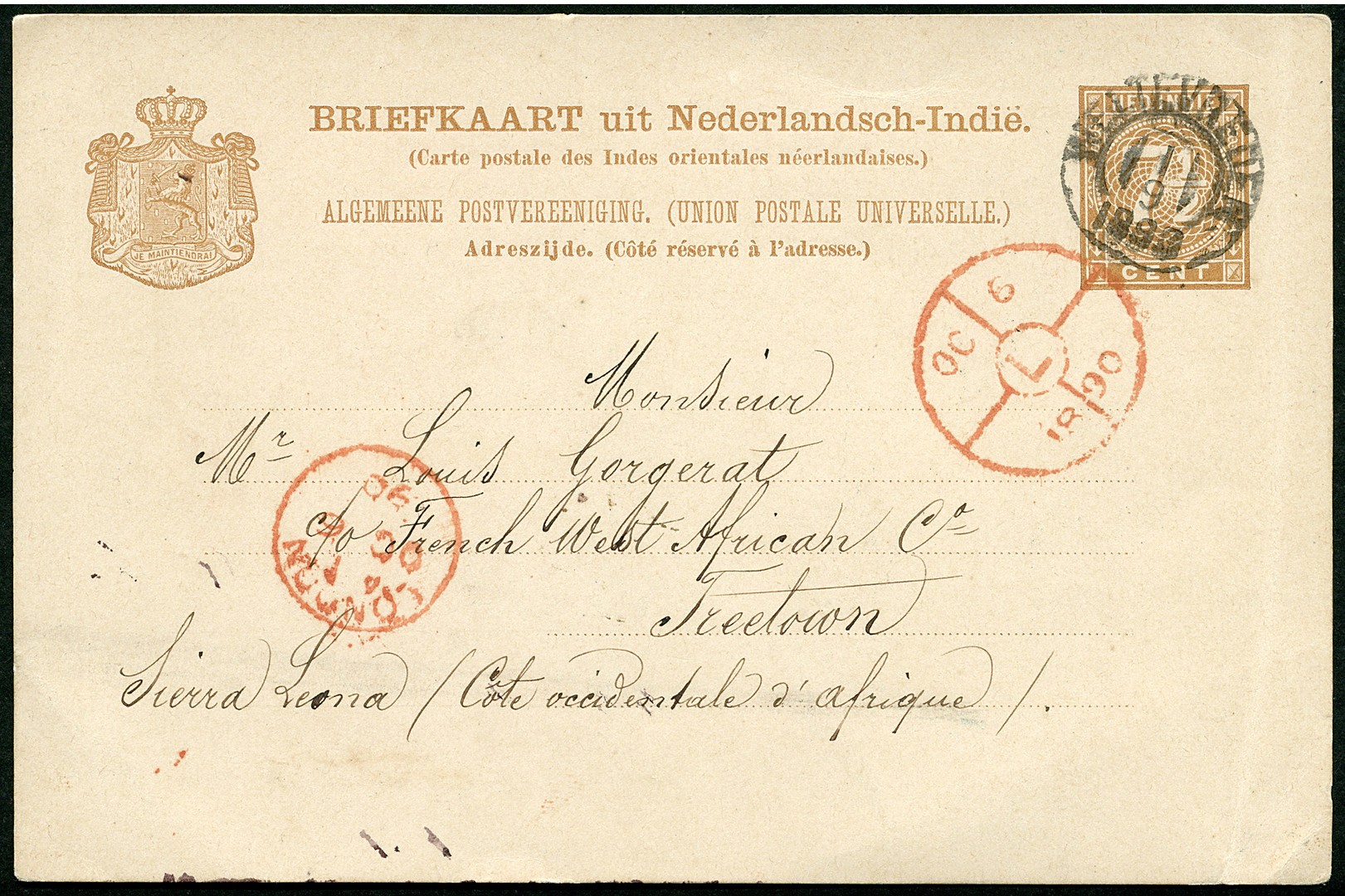 AFRIKA. SIERRA LEONE. Bk. G9 van Weltevreden 1-9-1890 via Londen 6-10 naar Freetown 27-10 (?), alsmede bk. G10 bijgefr. met 2½ op 3c (mist hoektand) van Soerabaja 21-4-1903 naar Freetown 9-6. Tevens 2 prentbk. uit Freetown (1901, 1907) naar Frankrijk. Schaarse bestemming vanuit Indië!
