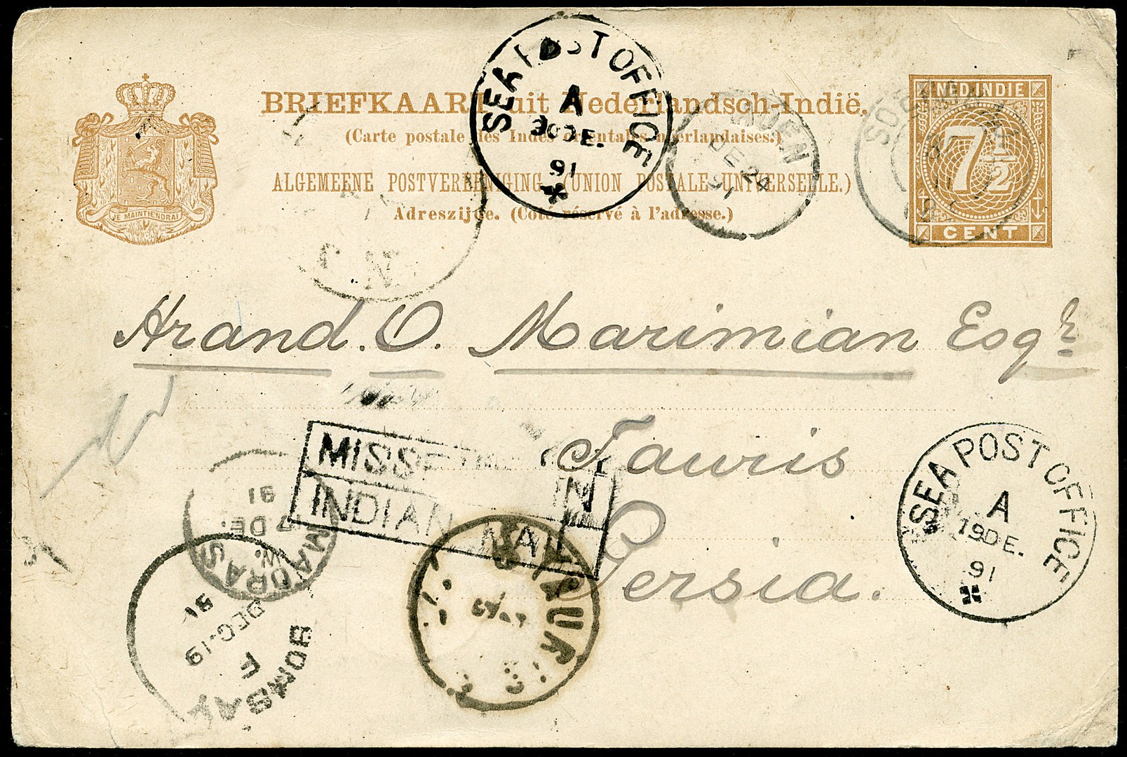 MARITIEM. PERZIË. SEA POST OFFICE A (19-12 en 30-12) op bk. G9 van Soerabaja 30-11-1891 over Singapore 7-12, Madras 17-12, Bombay 19-12, Aden 24-12 en Bouchir naar Tauris (Tabriz) 7-5 (?). Ergens onderweg moet het met de verzending mis zijn gegaan, zie ‘MISSENT IN / INDIAN MAIL’