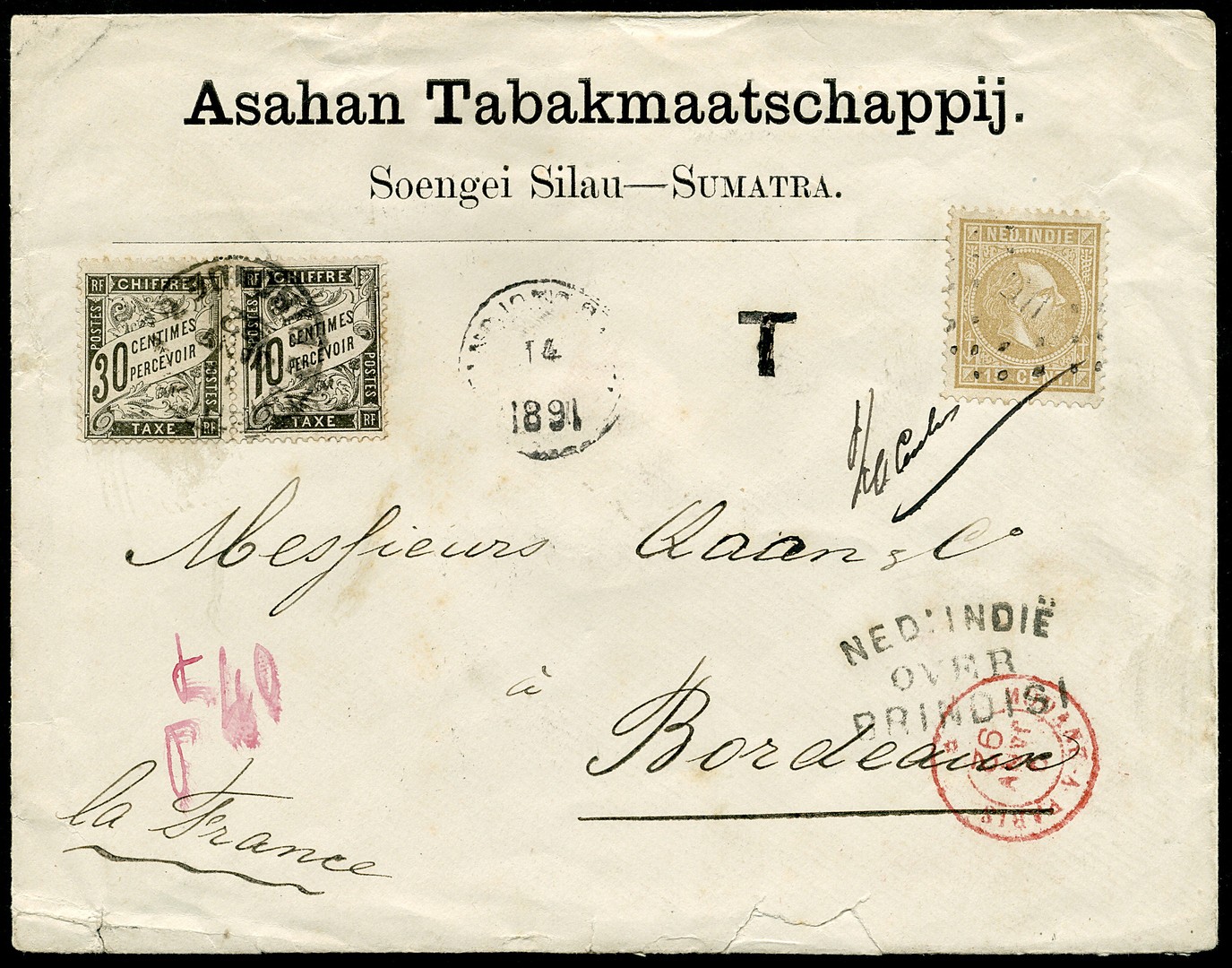 15 Cent nr. 11 op firmacouvert (az. iets ruw geopend), dus 10c te weinig, van Tandjongbalei 14-12-1891 via de N.I.Postagent Penang 16-12 over Brindisi en het traject Modane à Paris 9-1-1892 naar Bordeaux en daar op 11-1 met 40c beport