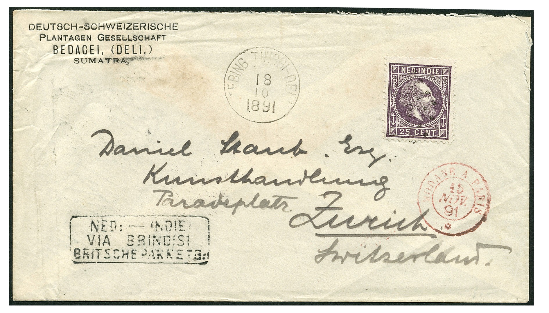 25 Cent als enkelfrankering met lichte afst. punt 113 op firmacouvert van Tebing Tinggi-Deli 18-10-1891 over Medan 20-10, de N.I.Postagent Penang 21-10, via Brindisi, traject Modane à Paris 15-11 naar Zürich 16-11