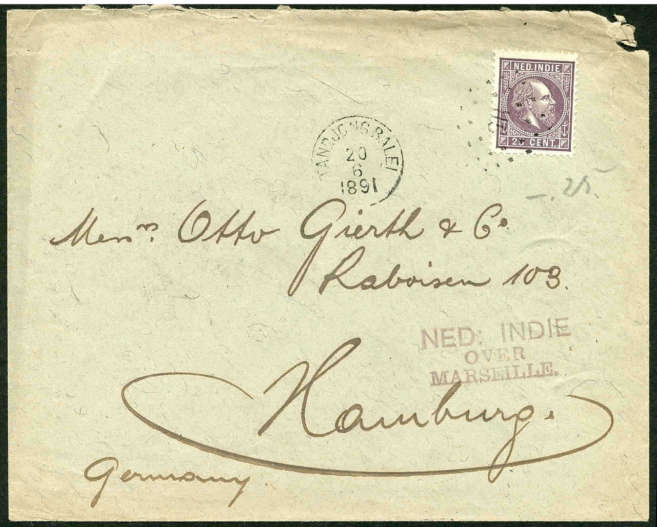 25 Cent als enkelfrankering met afst. punt 115 op env. van Tandjongbalei 20-6-1891 over de N.I.Agent Singapore 22-6 en Marseille naar Hamburg 21-7