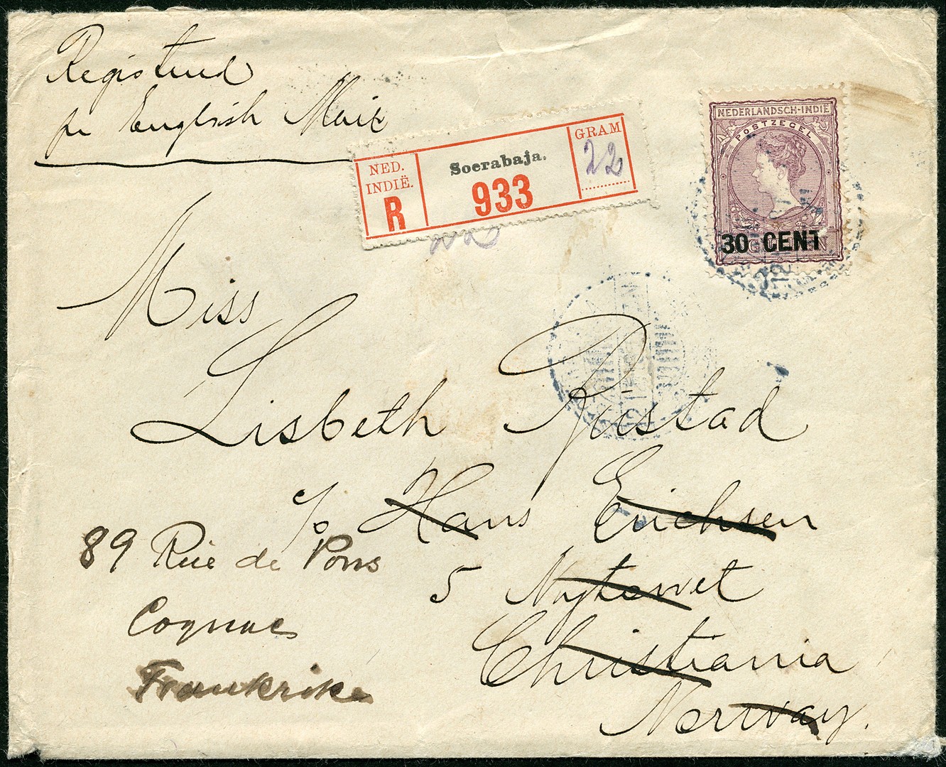 30 Cent nooduitgifte nr. 141 (vrijwel prachtex.) als enkelfrankering op env. van 22 gram, aangetekend van Soerabaja 12-12-1918 naar Kristiania (N) 8-3-1919, doorgez. naar Cognac (F) 20-3