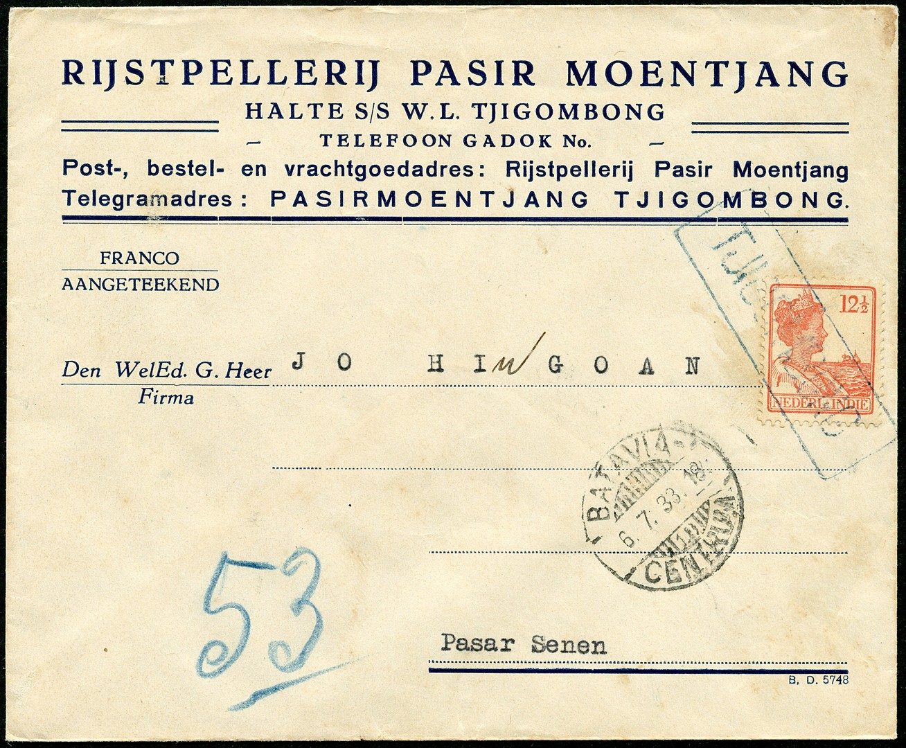 Prachtcouvert van een rijstpellerij gefr. met 12½c afgest. met haltestempel TJIGOMBONG via Batavia-/Centrum 6-7-1933 naar Pasar Senen (wijk in Batavia)