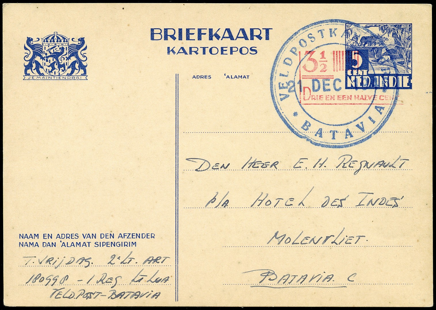 Bk. G61 met superbe afdruk in blauw van groot rondstempel 'Veldpostkantoor / Batavia / 21 dec 1946' (Bu.NM4c, echter in blauw), lokaal verstuurd