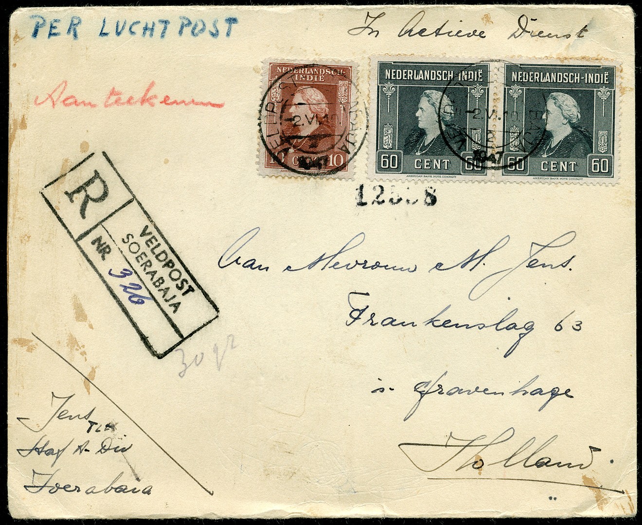 Env. van militair van 30 gram gefr. met ABC-zegels van 10c en 60c in paar aangetekend van Veldpost-Soerabaja 2-6-1947 per luchtpost naar Nederland, met op az. ovaalstempel 'Veldpost- / kantoor / Soerabaja. Zeldzaam R-stempel (niet in Bu. vermeld)