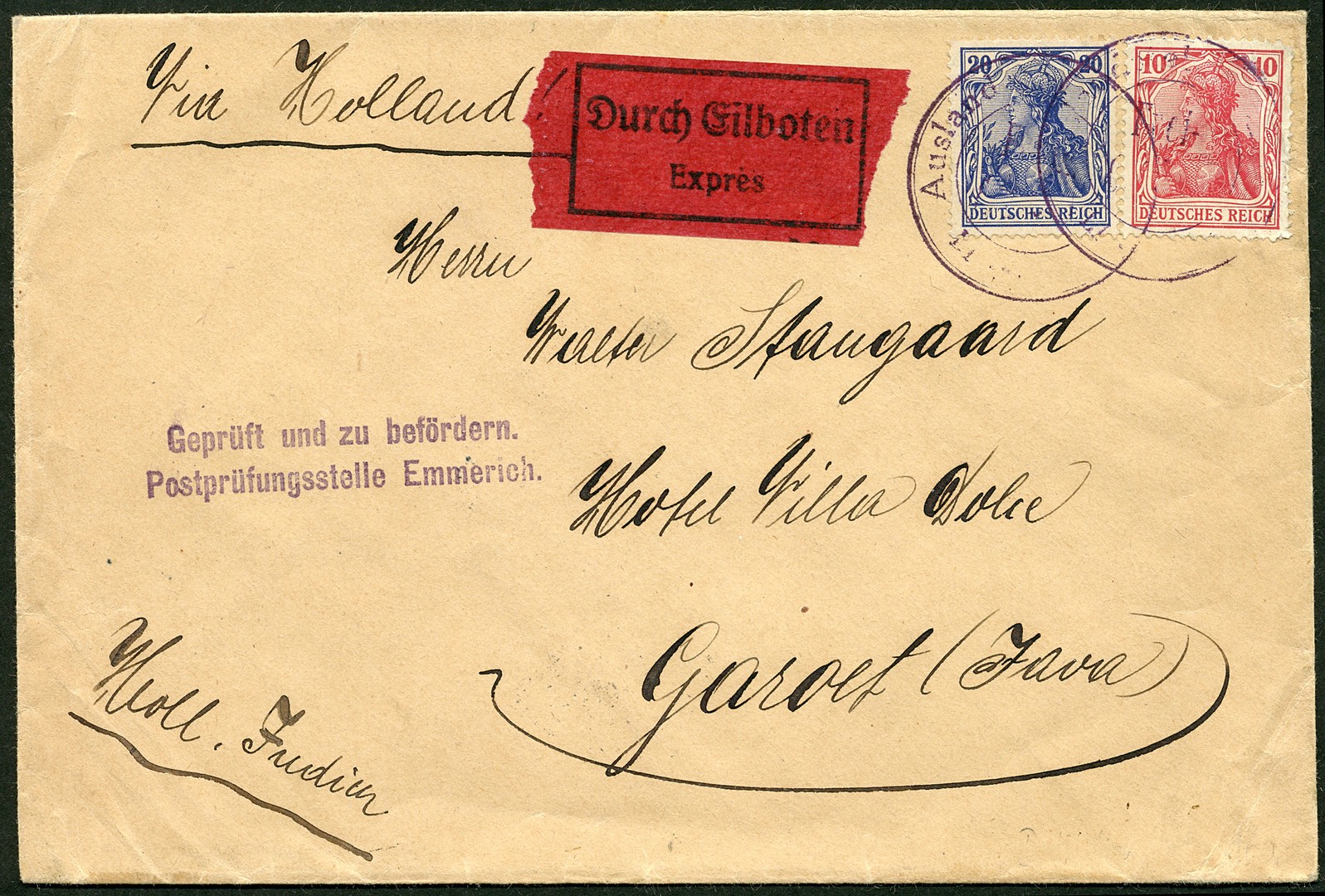 DUITSLAND. Env. gefr. met 10pf en 20pf afkomstig uit Pforzheim, zegels in violet afgest. met censuurstempel 'Auslandstelle Emmerich / Frei-'/ Gegeben', tevens op vz. 'Geprüft und zu befördern. / Postprüfungsstelle Emmerich.' verz. via Weltevreden 26-3-1916 naar een logé in het Hotel 'Villa Dolce' te Garoet 27-3