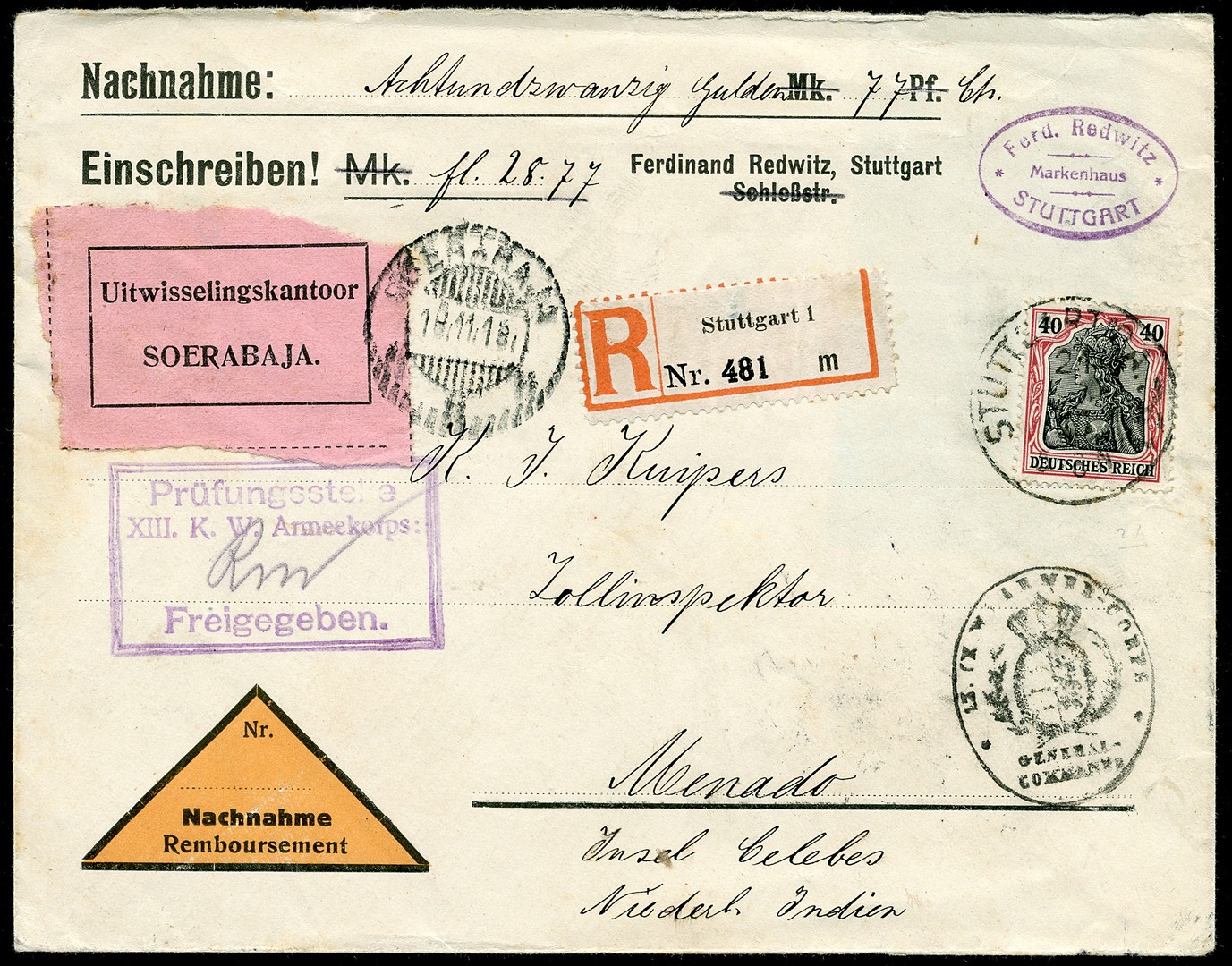 DUITSLAND. Env. (az. deel weggeknipt) met 40pf enkelfrankering, met aangegeven waarde van fl. 2877 als rembourszending van Stuttgart 21-10(?)-1918 via het Uitwisselingskantoor Soerabaja 18-11 naar een douane-inspecteur te Menado. Tevens militaire censuur van het XIII.K.W. Armeekorps. Het roze etiket hebben wij maar een enkele keer gezien