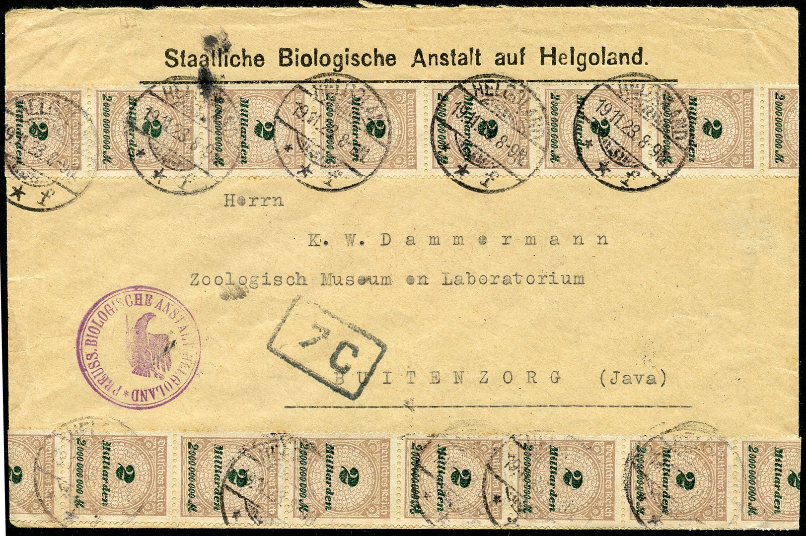DUITSLAND. Couvert van het 'Staatliche Biologische Anstalt auf Helgoland' opmerkelijk beplakt met op vz. en az. twee stroken van elk tien zegels van 2 miljard mark, tezamen dus 40 miljard mark, van HELGOLAND 19-11-1923 naar een lab te Buitenzorg 20-12. Zeer bijzondere brief!