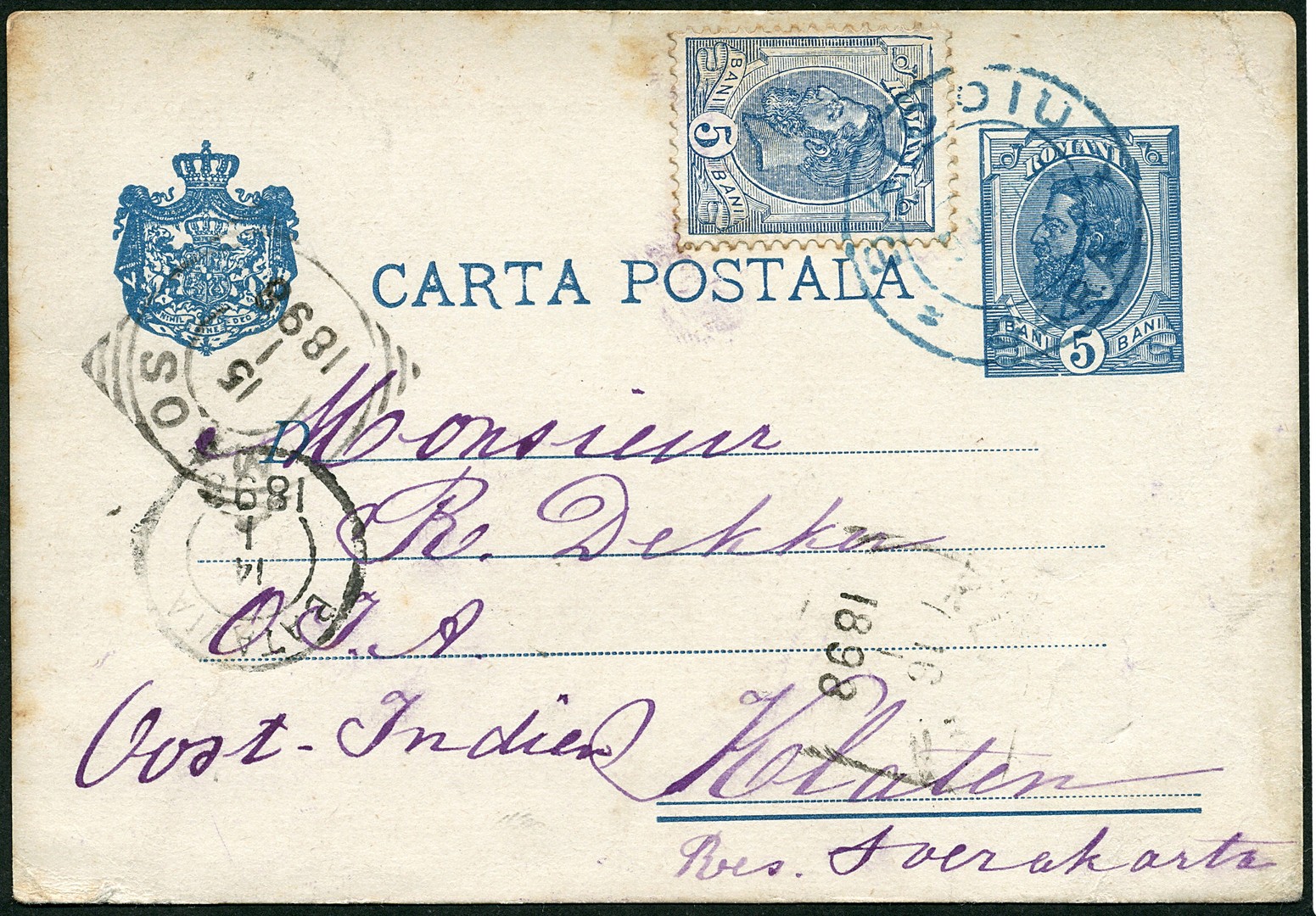 ROEMENIË. Drie briefkaarten, van Baicoiu 27-12-1897 over Batavia 14-1-1898 en Maos naar Klaten 16-1, van Galati-Docuri 24-9-1904 over de N.I.Postagent Penang 19-10 naar Medan, en van Ploesti 7-6-1907 naar Soerabaja 8-7 (met oude prentbk. van Ploesti). Tevens env. van Oradea 11-10-1928 aangetekend via Bucarest 12-10, Constanta-Port 15-10 en Port-Said 26-10 naar Soerabaja 20-11. Ook bk. uit Bulgarije (Sofia) naar Soerabaja (1910)