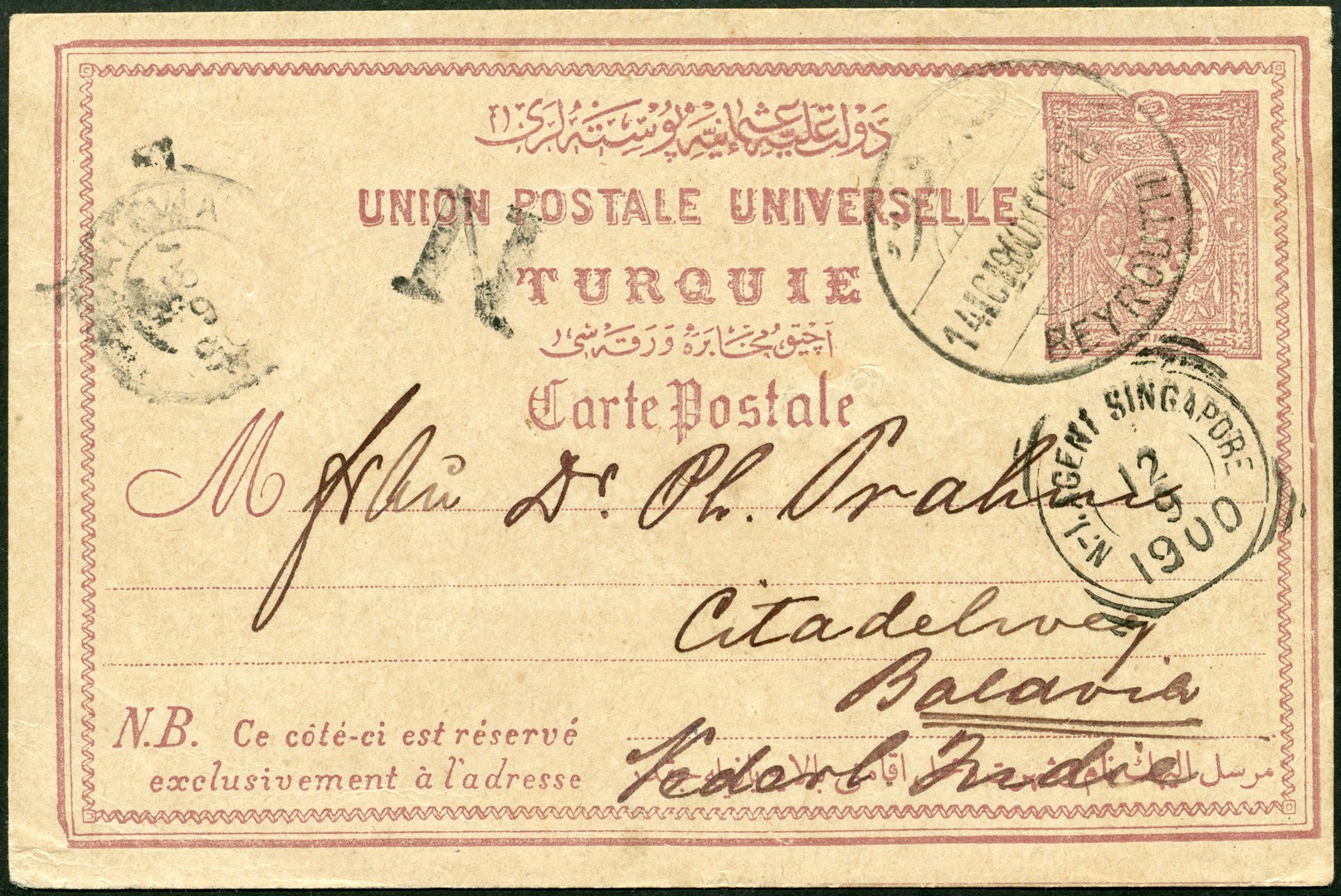 TURKIJE. Bk. van 20p van Beyrouth 14-8-1900 via Port-Said 22-8, Colombo 7-9 en de N.I.Agent Singapore 12-9 naar Batavia 15-9 en in de namiddag besteld (N)